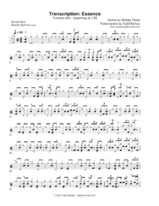 Here’s Mickey Roker playing behind Donald Byrd on Essence, from Byrd’s record Electric Byrd. It’s vibey modal thing, in a slower 4/4 swing feel. It looks busy on the page, but this is mostly about groove, which is exceedingly deep. Tempo is about 88 bpm.